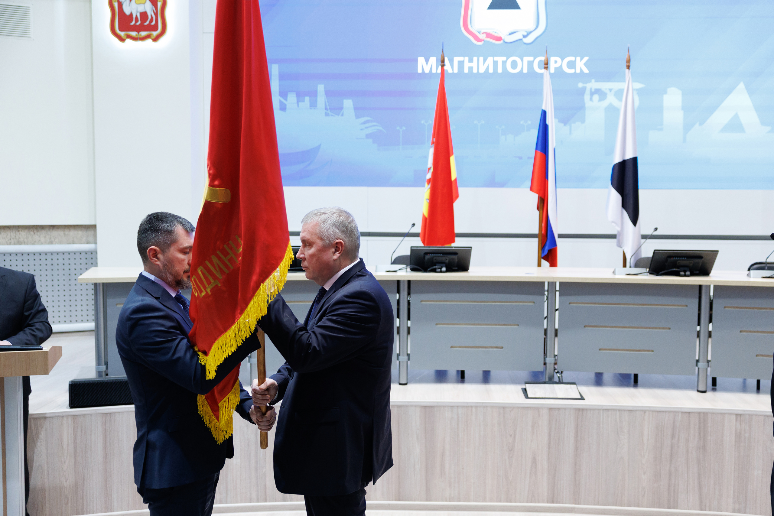 Копию боевого знамени 1548-го тяжелого самоходно-артиллерийского полка Денис Моисеев передал генеральному директору публичного акционерного общества «Магнитогорский металлургический комбинат», заместителю председателя Законодательного Собрания Павлу Шиляеву.