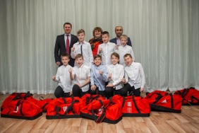 Подарочные комплекты из формы (фтуболка, шорты, гетры), мячи, спортивные сумки, а также перчатки для вратарей и костюмы для тренеров получили футбольные команды челябинских школ № 3, 138 и увельской школы № 1.