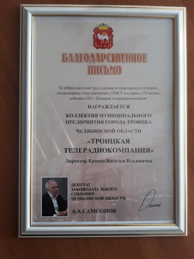 За добросовестный труд, плодотворное сотрудничество с ОМСУ и в связи с 25- летним юбилеем команду Троицкого ТВ Андрей Самсонов также отметил благодарственным письмом.